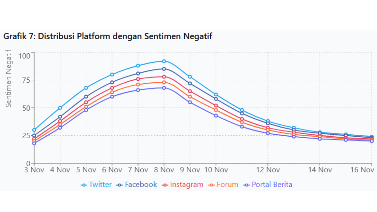 Distribusi platform dengan sentimen negatif menunjukkan dinamika yang konsisten di berbagai ruang digital sepanjang periode analisis. Twitter menempati posisi teratas sejak awal hingga akhir periode, mencapai puncak 92 persen konten negatif pada tanggal 8 November sebelum turun menjadi 24 persen pada tanggal 16 November. Facebook mengikuti dengan pola serupa, dari 25 persen pada tanggal 3 November menjadi 85 persen pada puncaknya, lalu turun ke 23% di akhir periode.