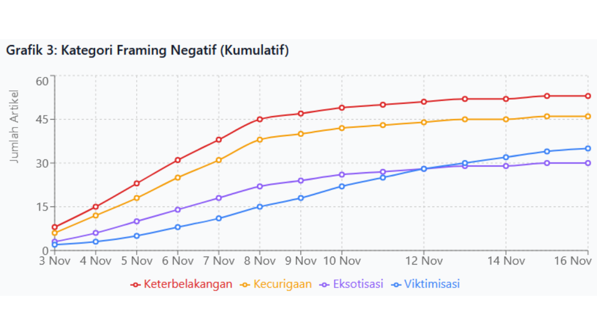 Ketika mengkaji lebih dalam kategori framing negatif yang digunakan media sepanjang periode analisis, terungkap empat pola dominan yang secara konsisten muncul dalam pemberitaan. Framing "keterbelakangan" menjadi yang paling masif dengan akumulasi 53 artikel yang secara eksplisit atau implisit menggambarkan SAD sebagai kelompok primitif, terisolasi, dan tidak beradab. Kategori "kecurigaan" menghasilkan 46 artikel yang membingkai keberadaan Balqis di tengah SAD sebagai indikasi keterlibatan mereka dalam penculikan, meskipun tidak ada bukti forensik yang mendukung. Framing "eksotisasi" muncul dalam 30 artikel yang memperlakukan SAD sebagai objek wisata antropologis. Fakta yang menarik, framing "viktimisasi" yang menempatkan SAD sebagai korban diskriminasi justru mengalami peningkatan signifikan di periode akhir analisis, mencapai 35 artikel pada tanggal 16 November.