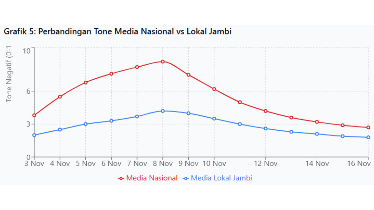 Perbandingan antara tone media nasional dan media lokal Jambi mengungkapkan disparitas yang signifikan dan konsisten sepanjang periode analisis. Media nasional menunjukkan tone negatif yang jauh lebih tinggi, dimulai dari angka 3.8 pada tanggal 3 November dan mencapai puncaknya di 8.7 pada tanggal 8 November. Sebaliknya, media lokal Jambi menunjukkan tone yang relatif lebih moderat, dimulai dari 2.0 dan hanya mencapai 4.2 pada puncaknya.