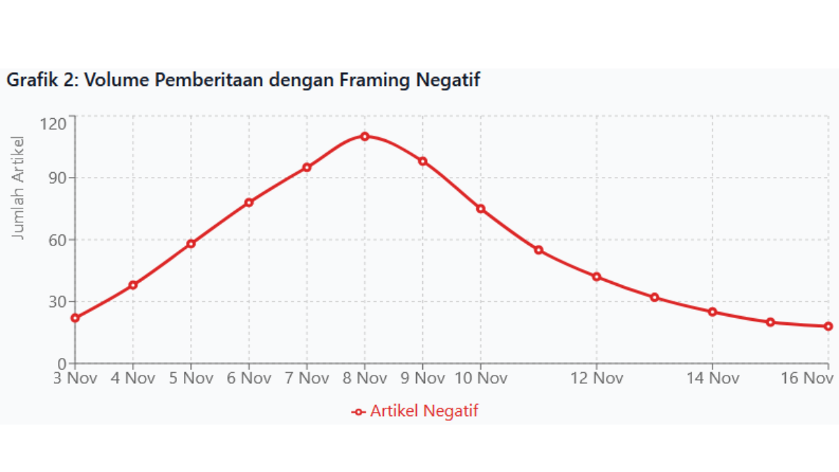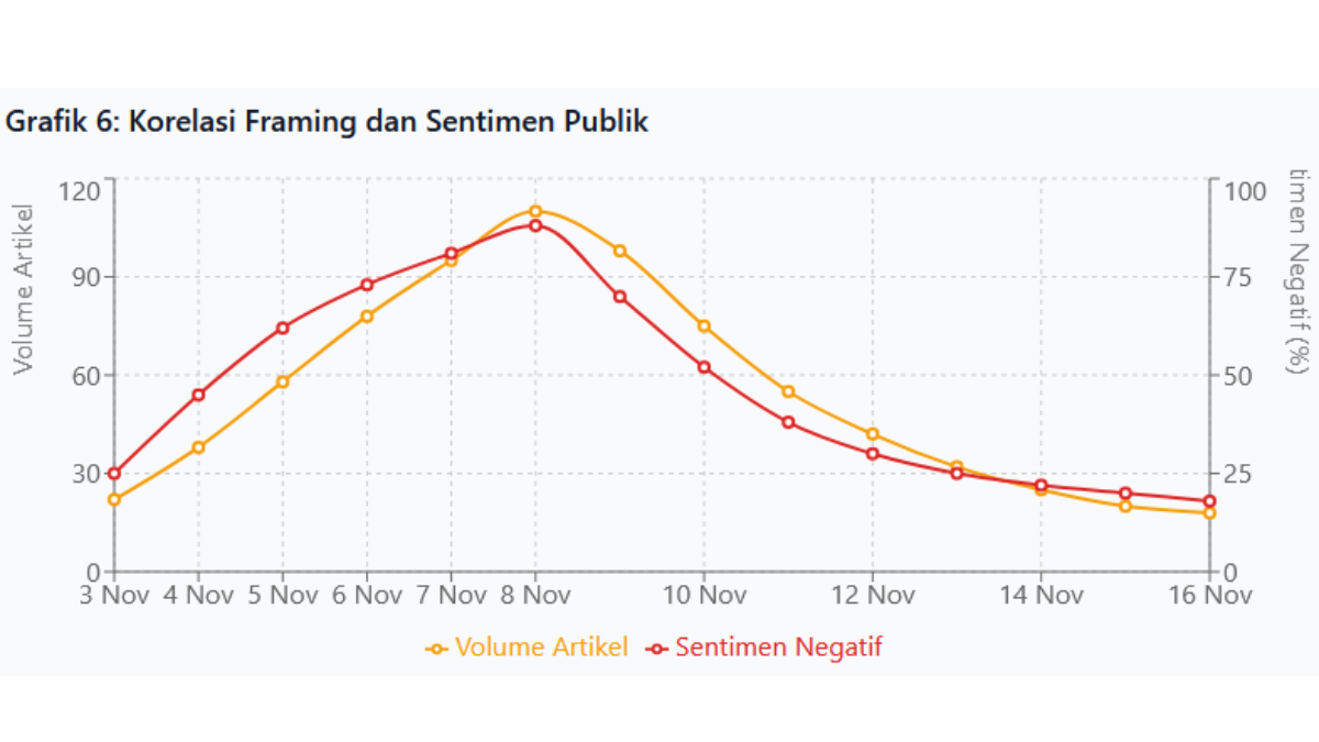 Korelasi antara volume pemberitaan dan sentimen publik menunjukkan hubungan yang sangat erat sepanjang periode analisis. Setiap kenaikan volume artikel dengan framing negatif diikuti oleh peningkatan sentimen negatif publik yang hampir proporsional. Ketika volume artikel mencapai 110 pada tanggal 8 November, sentimen negatif publik juga mencapai puncaknya di 88%.