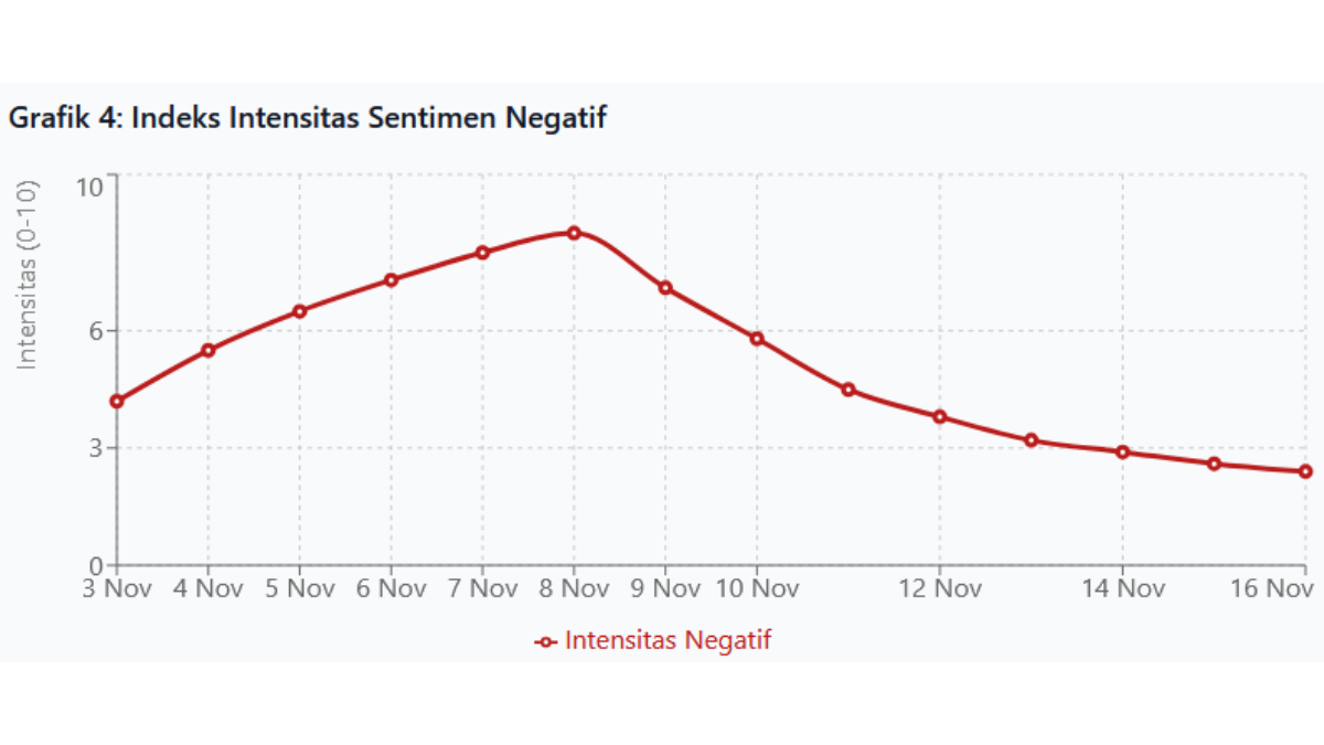 Indeks intensitas sentimen negatif memberikan gambaran yang lebih mendalam tentang seberapa keras dan emosional narasi negatif tersebut dikonstruksi. Pada skala 0 hingga 10, di mana 0 menunjukkan tidak ada sentimen negatif dan 10 menunjukkan sentimen negatif yang ekstrem, indeks ini menunjukkan tren yang mengkhawatirkan. Dari angka 4.2 pada tanggal 3 November, intensitas meningkat secara konsisten hingga mencapai puncaknya pada angka 8.5 di tanggal 8 November.