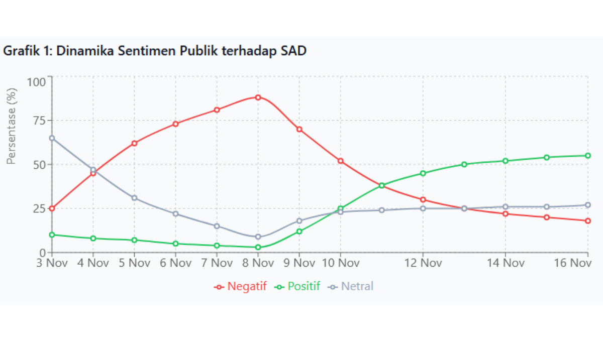 Volume pemberitaan mulai menurun secara signifikan setelah tanggal 9 November. Pada tanggal 16 November, hanya tersisa 18 artikel dengan framing negatif, menunjukkan penurunan hampir 85 persen dari puncaknya. Namun, penurunan volume ini tidak serta-merta menghapus dampak dari ratusan artikel yang telah tersebar selama periode sebelumnya. Narasi negatif yang telah terbentuk memiliki efek jangka panjang dalam membentuk persepsi kolektif masyarakat terhadap SAD.