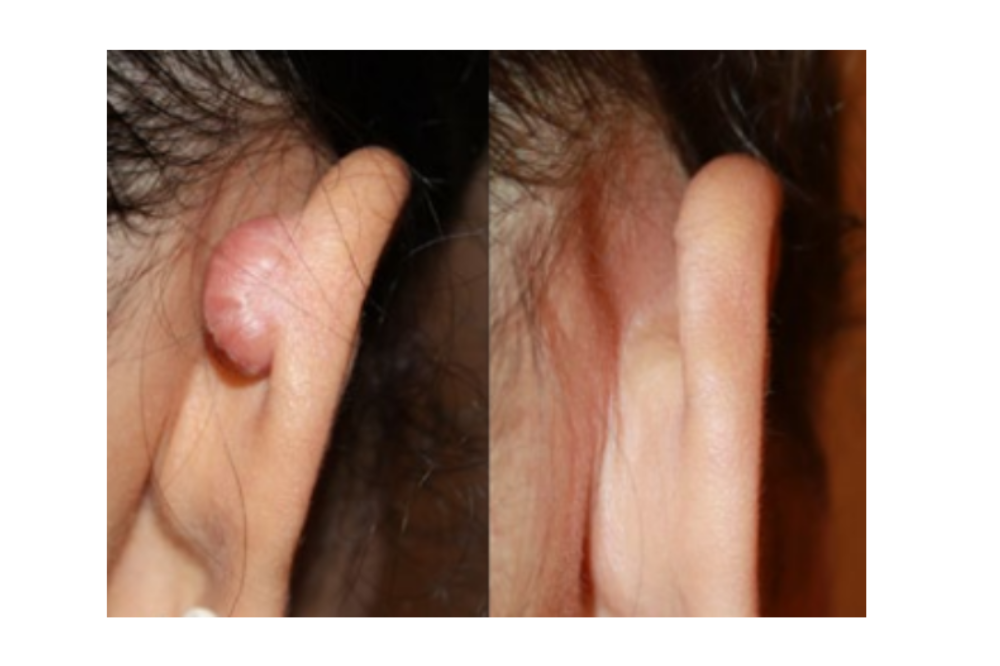 Kista epidermoid adalah benjolan yang muncul karena penumpukan sel kulit mati yang terperangkap di bawah kulit, biasanya setelah ada iritasi atau cedera kecil. Benjolan ini jinak dan umumnya tidak berbahaya. Sementara itu, kista sebasea terjadi akibat penyumbatan pada kelenjar minyak, dan terasa seperti benjolan keras di belakang telinga. Biasanya tidak menimbulkan nyeri, tetapi dapat mengganggu jika ukurannya semakin besar.
