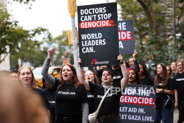 Staf Doctors Without Borders (MSF) dan pekerja medis berkumpul di depan Markas Besar PBB untuk menyerukan para pemimpin dunia mengambil tindakan dan mengakhiri genosida di Gaza, Rabu, 17 September 2025 di New York. - (AP Photo/Jason DeCrow)